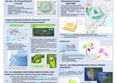 12.Pan-European coordination action on CO2 Geological Storage” – CGS Europe (2010-2013) –proiect finanțat în cadrul Programului Cadru 7. Obiectivul principal al proiectului a fost promovarea cooperării la nivel european în domeniul cercetării stocării geologice a CO2 și realizarea unor platforme și materiale pentru diseminarea cunoștințelor din domeniu. Proiectul, sub coordonarea BRGM (Franța), a adunat 34 de instituții de cercetare din 25 state membre UE și 4 state asociate. Cooperarea din cadrul CGS Europe s-a făcut în strânsă legătură cu activitățile Asociației CO2GeoNet, în care GeoEcoMar a fost acceptat ca membru, la finalul proiectului.
