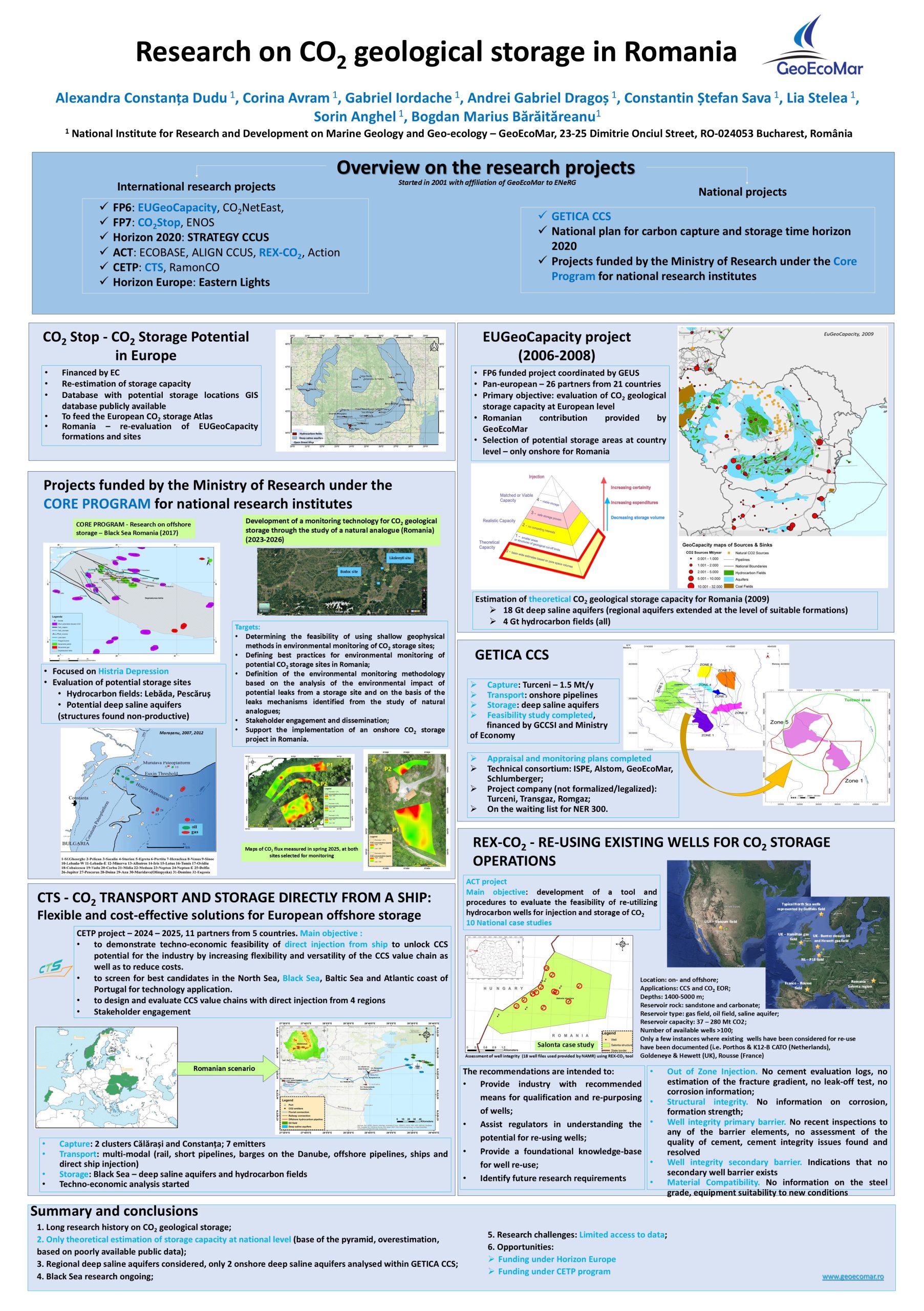 - PN 23300404 ”Dezvoltarea unei metodologii de monitorizare de mediu pentru potențialele situri de stocare de CO2 din România”. https://geoecomar.ro/proiecte/pn23300404-dezvoltarea-unei-metodologii-de-monitorizare-de-mediu-pentru-potentialele-situri-de-stocare-de-co2-din-romania/